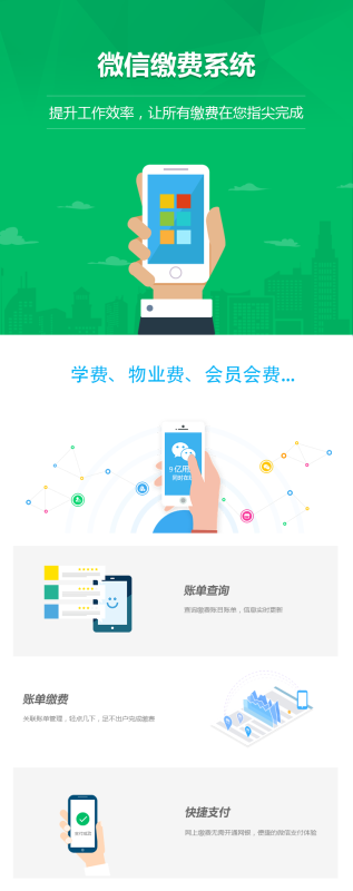 1、 通過接入微信支付繳費,提供收取學費、物業費、會員(yuán)會費等各類項目收費,簡化工(gōng)作(zuò)量,提高工(gōng)作(zuò)效率,便捷的生(shēng)活繳費服務;
